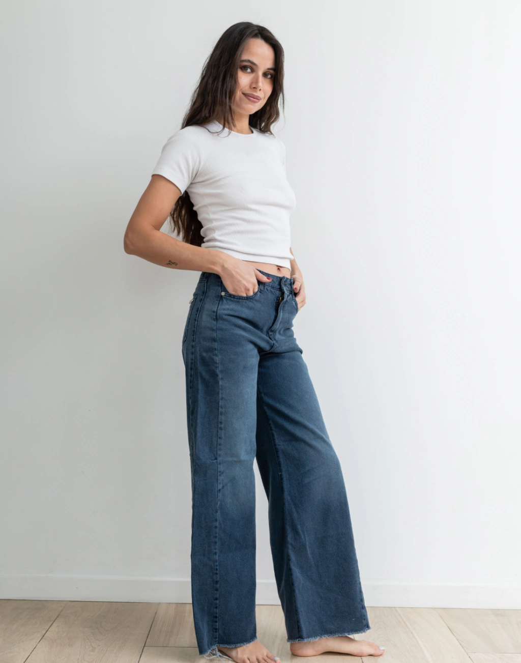 Jean rígido, color azul con matices oscuros.Tiro medio, baggy balloon, con recorte lateral. Es un modelo clásico, no overside.